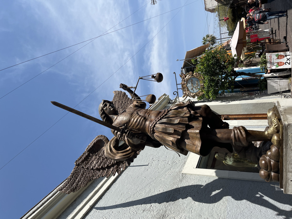 A bronze statue of an angel holding scales and a sword stands against a bright blue sky. The angel has wings and wears a short skirt. The statue is placed in front of a white building with a decorative sign above a window. People walk on a sidewalk in the background. A palm tree and vendor stalls are also visible.