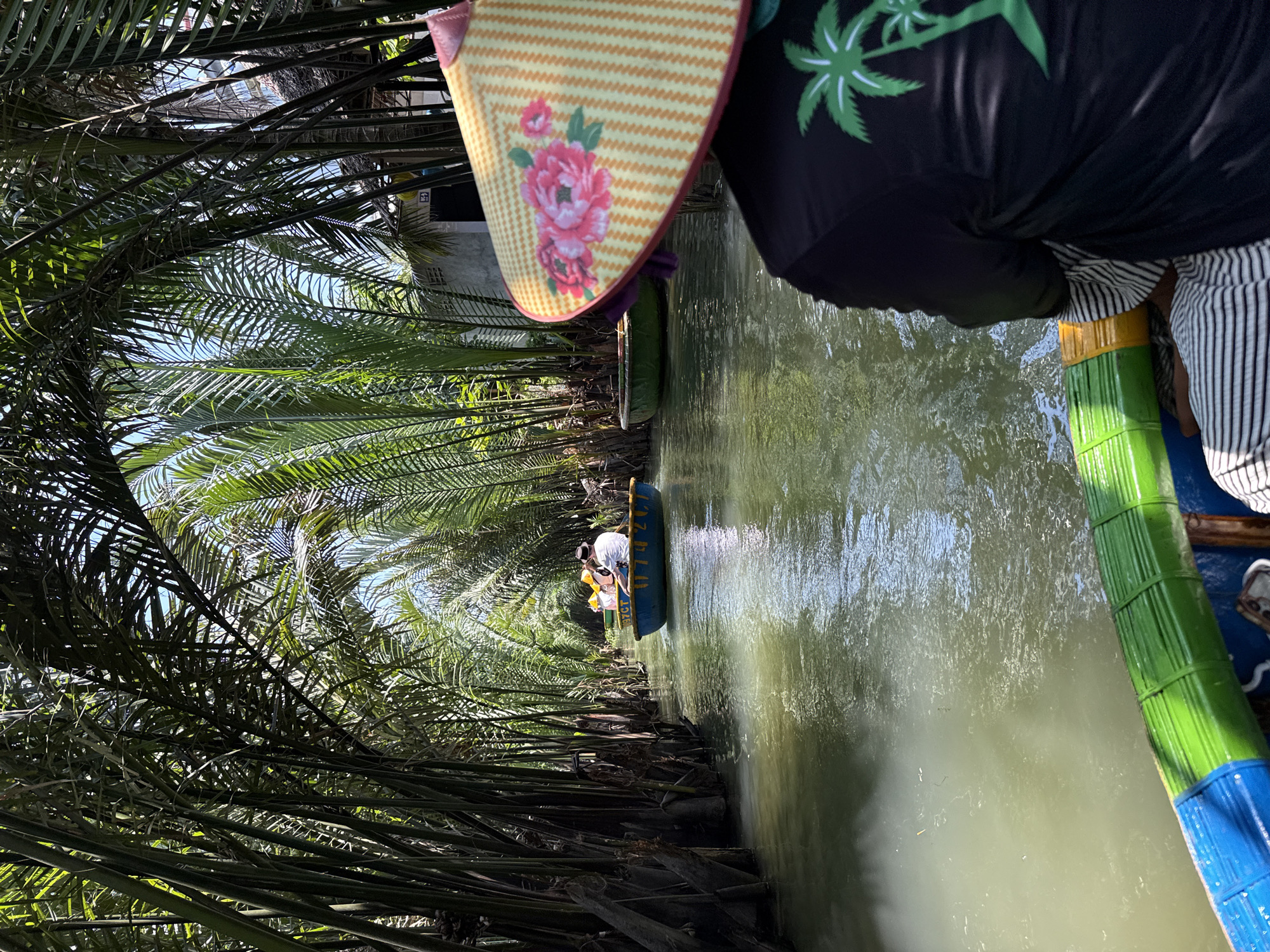 From a low-angle, point-of-view perspective, the image depicts a narrow canal scene in Vietnam, likely near Đà Nẵng, characterized by dense foliage. A floral-patterned conical hat, typical of Vietnamese headwear, and a portion of a person's black shirt with a green palm tree emblem are visible in the upper part of the frame, suggesting the viewpoint is from a boat with passengers. In the center of the frame, another boat, light blue with visible passengers, is seen navigating down the canal. The canal is flanked by dense, dark-trunked trees with green fronds forming a natural tunnel over the waterway. The water in the canal appears green, reflecting the surrounding vegetation. A portion of a green and blue object is located bottom-right corner of the image. The overall lighting is bright.