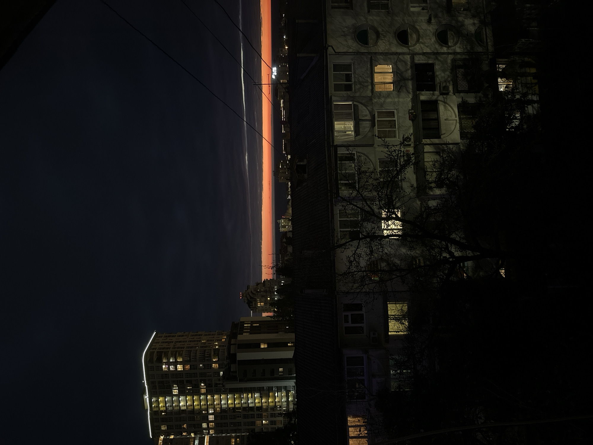 The image presents an urban cityscape in Sochi, Russia, during twilight. A prominent band of intense orange-red light marks the horizon, indicative of sunset over a body of water or distant flat terrain. The sky above transitions to dark blue and black with faint cloud formations. In the foreground, the upper sections of dark, leafless trees are visible, partially obscuring an older, multi-story residential building in the midground. This building features a light-colored facade with a dark, sloped roof, multiple rectangular windows, and distinctive circular and semi-circular architectural elements; several windows emit warm yellow interior light. An air conditioning unit is mounted on its facade. Above this structure, three dark power lines stretch diagonally from the upper left to the upper right of the frame. To the left of the older building, a tall, modern high-rise building with a light-colored facade dominates a portion of the background. It is brightly illuminated with numerous interior lights visible through its windows, and a continuous white light strip defines its rooftop perimeter. Further right and deeper in the background, another multi-story building with a distinct, possibly terraced or rounded roofline is discernible, also with illuminated windows. Along the distant horizon, beneath the striking band of sunset glow, the dark silhouettes of additional city buildings are visible. On the far right, a brightly illuminated sign displaying the Cyrillic letters "ВТБ" (VTB) is prominently featured on a rooftop. No individuals or specific actions are discernible within the frame.