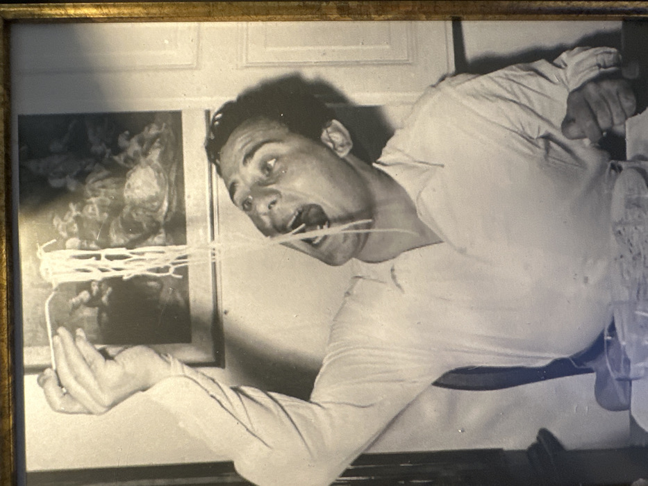 This framed black and white photograph depicts a male individual in Suresnes, France, in the process of eating spaghetti
