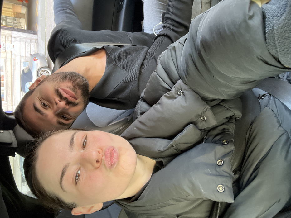 A daytime image, captured as a selfie from within a vehicle, features a female and male subject