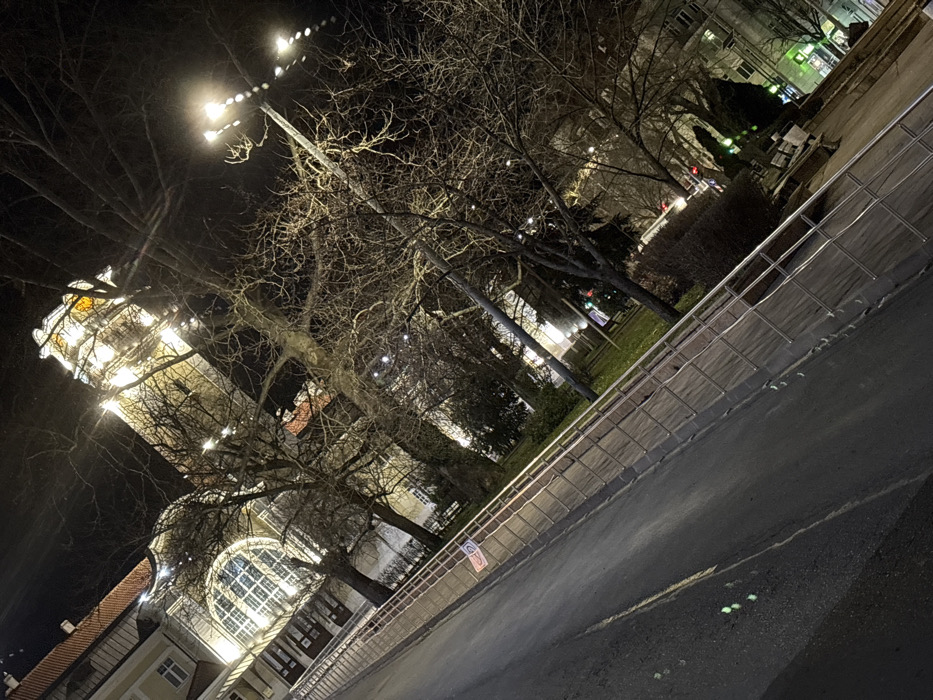 The image displays a nighttime urban scene in Burgas, Bulgaria, captured with a diagonal orientation. The prominent landmark is the Burgas Clock Tower, a tall, square-based structure, extensively illuminated with warm-toned string lights, visible in the central-background. Adjacent to the tower on the left, a multi-story building with a light-colored facade, large arched windows, and a tiled roof is partially visible and also illuminated. In the immediate foreground, a dark paved surface, possibly asphalt, exhibits a faint light-colored line. A metal railing runs diagonally from the lower-left to the middle-right, separating the paved area from a pedestrian walkway and a public park. A small, mostly white sign with red and blue elements is affixed to this railing. The park area, situated behind the railing, contains numerous bare deciduous trees, indicative of winter or early spring. Some of these trees are sparsely decorated with small, warm-toned string lights. Multiple streetlights with upward-facing luminaires are visible, casting illumination throughout the scene. Further in the background, to the right, additional multi-story buildings with illuminated windows and storefronts, some displaying green lighting, suggest commercial or residential activity. A single individual, dressed in light-colored clothing, is faintly visible walking or standing in the lower-right background portion of the park area. The scene is lit entirely by artificial light sources.