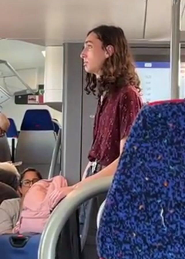interior of a train car. A person with long, curly brown hair is standing in the aisle, wearing a maroon patterned shirt and dark pants. They are looking towards the front of the train. Seated passengers are visible, including a woman with glasses and a pink blanket or jacket over her legs. The train's seating is blue with a patterned design. A digital timetable display is visible in the background. The train appears to be moving.