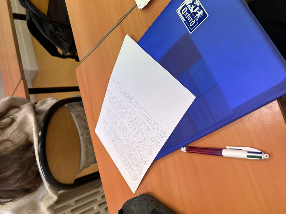 The scene depicts a classroom in Strasbourg, France, observed from a low angle, focusing on a desk in the foreground
