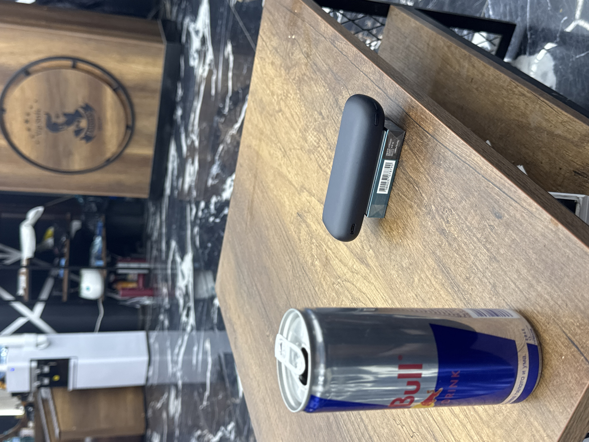 The image depicts an interior scene within a barbershop, identified by a prominent "Top Style" logo, located in Vratsa, Bulgaria. A wooden two-tiered coffee table occupies the foreground. On its upper surface, an opened, partially consumed silver and blue Red Bull energy drink can stands upright to the left. Visible text includes "Red Bull" and Bulgarian phrases such as "на тялото и ума." To the right, a matte black, elongated electronic vaping device rests horizontally on a small, rectangular teal-colored package. A barcode, "3800237078790," is discernible on the package. The floor features highly reflective black marble-patterned tiles with white veining. In the background, a white water dispenser with two spigots is visible to the left. Centered in the background is a large wooden sign with a circular black frame, displaying the barbershop's logo—a stylized male head with a beard and bowtie—and the text "Top Style." Further elements include a dark shelving unit and a wall adorned with a white 'X' pattern. No individuals are present.