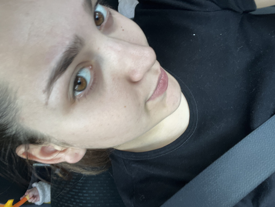 This image displays the interior of a vehicle. The primary subject is a young adult female with light skin, brown eyes, and dark hair, visible from the chest up, positioned in a vehicle seat. She is wearing a black t-shirt and a dark-colored seatbelt diagonally across her left shoulder and chest. Her head is slightly tilted, and her gaze is directed towards the camera, with a subtle downward curve to her mouth. In the upper left background, partially obscured, is the small, light-skinned hand of an infant, wearing a light grey sleeve, holding a yellow and orange object. The background elements indicate dark vehicle interior components, including a dark car seat. The specific location of Oberhausbergen, France, cannot be confirmed or denied based solely on the visual information present in the image.