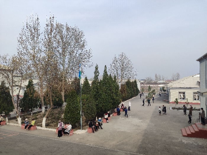 The image depicts an outdoor courtyard within an institutional complex, identified as being in the city of Rishtan, Uzbekistan. The environment is characterized by an overcast, light grey sky and a large, primarily unpaved central area. Several mature deciduous trees, mostly bare of leaves, are present, alongside rows of evergreen conifer trees forming hedges. Their trunks are painted white at the base. The foreground features a paved section with visible hopscotch markings on the bottom left. Along this paved edge, low, rectangular benches or planters, painted in yellow, red, and white, are occupied by groups of individuals, predominantly appearing to be children or young adults, seated and conversing. In the mid-ground, a tall flagpole displays the national flag of Uzbekistan. Numerous other individuals, also appearing to be young, are scattered across the courtyard. Some are walking or standing, while a distinct group near the center-right is engaged in more dynamic movement, possibly playing. A white statue is visible among the evergreen trees in the mid-ground. The background consists of several single-story and two-story buildings with light-colored facades and grey roofs, consistent with institutional architecture. One building on the far right features red-brown steps leading to an entrance, where a few individuals are gathered. A low wall separates the complex from what appears to be a residential or less developed area in the far distance.