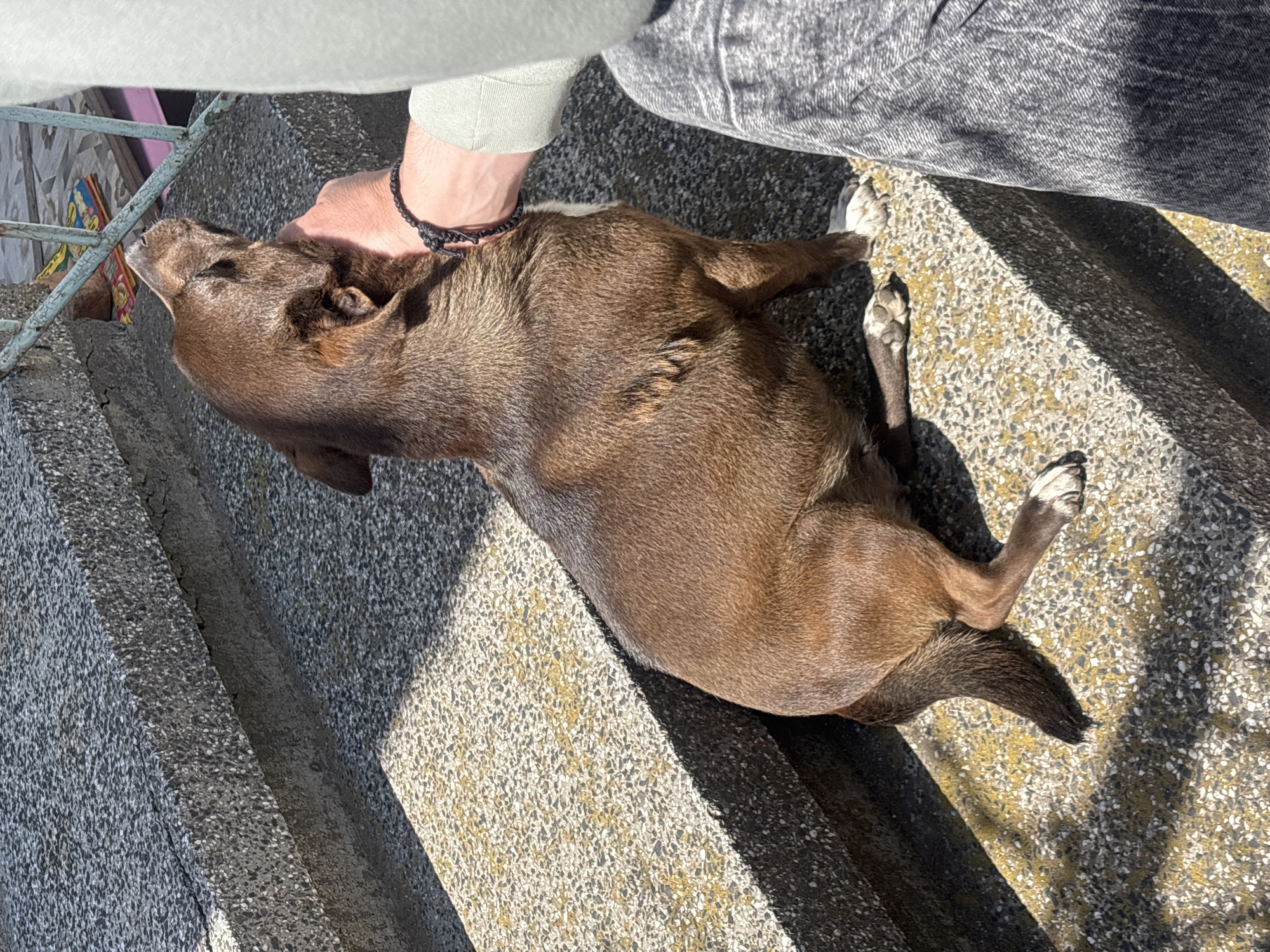 - "A medium-sized, brown dog rests on a concrete stairway in Varbitsa, Bulgaria" by FM-IJq4w1, licensed under CC BY 4.0