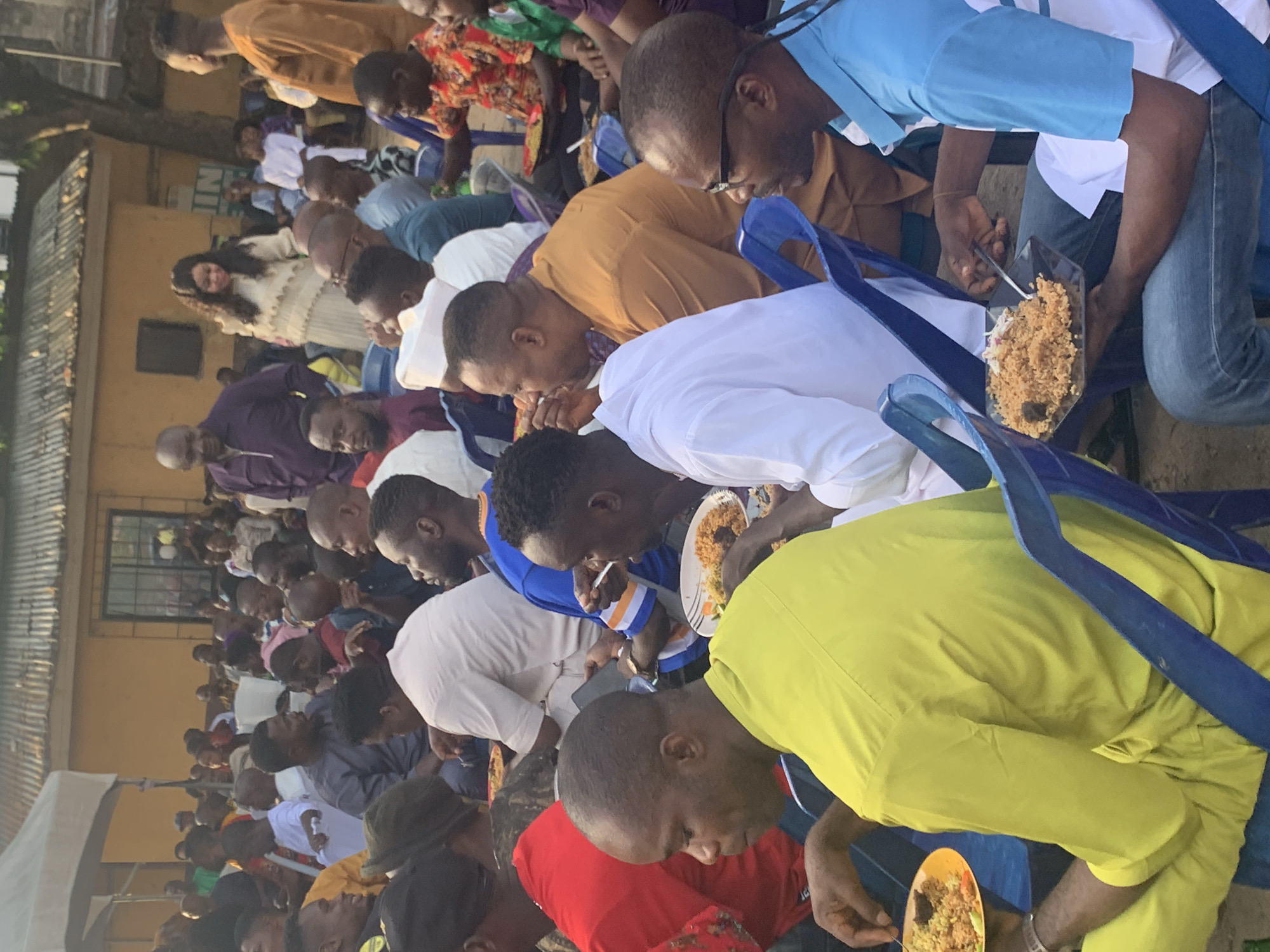 A large group of people are seated in blue plastic chairs outdoors, seemingly eating a meal. The people are of African descent. Many hold plates of food and are looking down, presumably eating. The attire varies, including white shirts, blue shirts, yellow shirts, and patterned clothing. A building with a window and metal bars is visible in the background. The overall impression is a gathering or event in the city of Umuode, Nigeria, where food is being served.