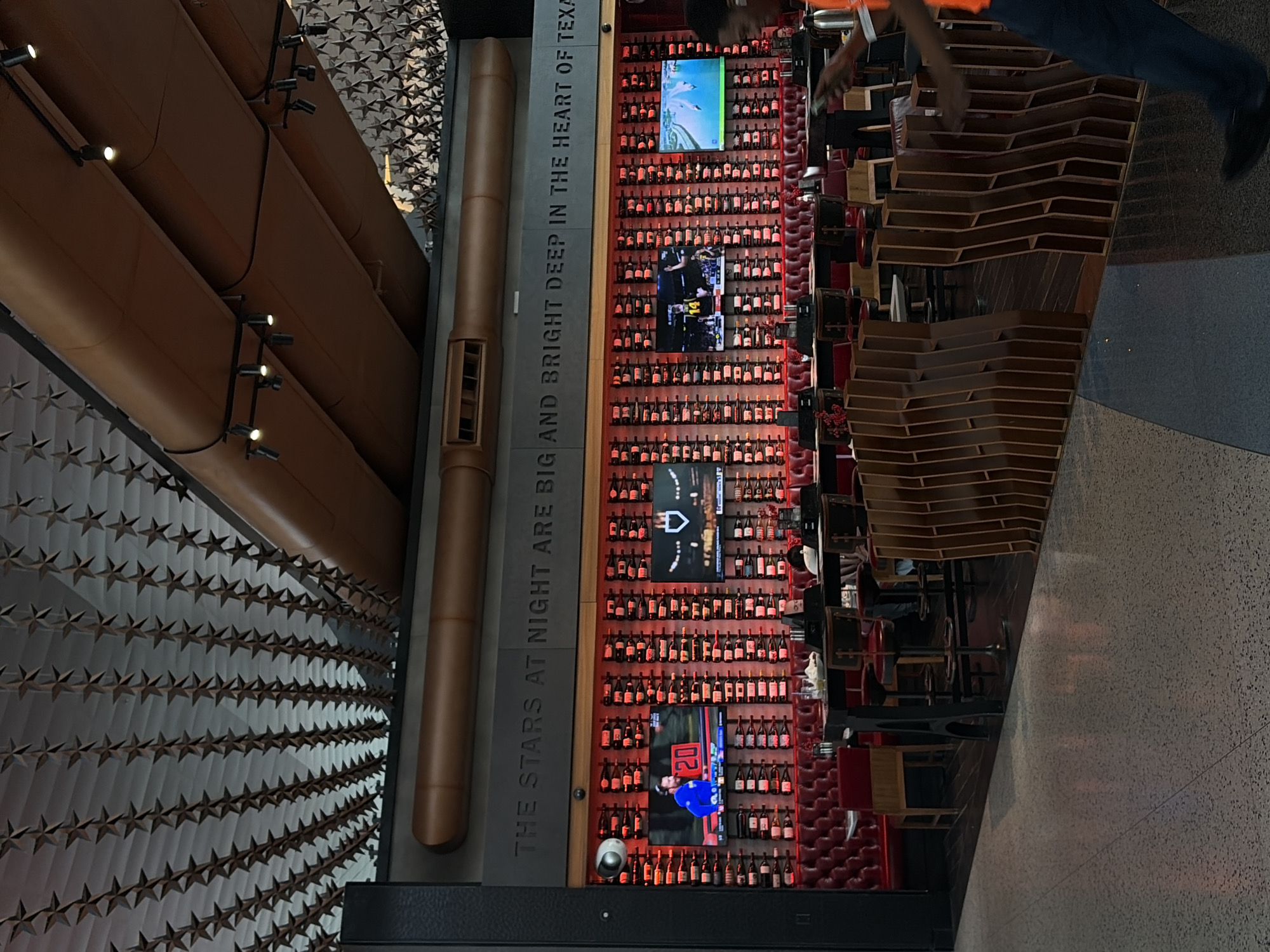 interior of a restaurant or bar in Houston, Texas. A long wall is adorned with rows of illuminated wine bottles, interspersed with large TV screens displaying various content. The wall also features the text "THE STARS AT NIGHT ARE BIG AND BRIGHT DEEP IN THE HEART OF TEXA," a reference to the famous Texan song. In the foreground, there are modern wooden seating arrangements and bar stools. Patrons and staff can be seen occupying the space. The overall ambiance suggests a lively and upscale establishment.