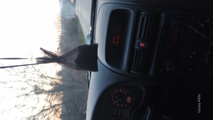 The image depicts the interior of a vehicle, viewed from the driver or front passenger seat, looking forward through the windshield