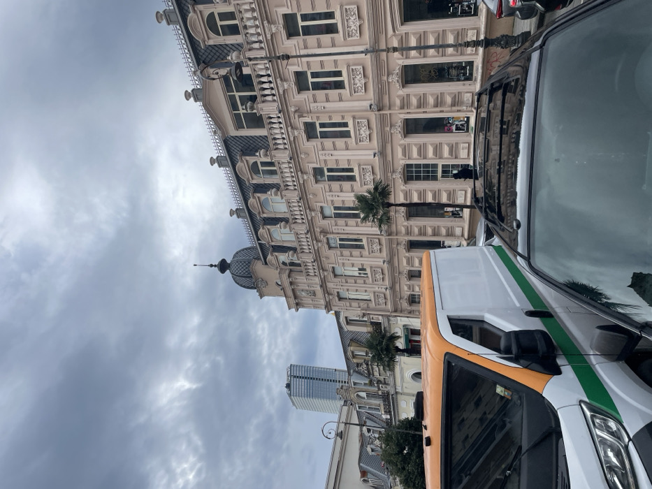The image displays an urban street scene in Batumi, Georgia, observed under an overcast sky. In the foreground on the left, a white commercial van with an orange upper section and a prominent green horizontal stripe on its lower body is parked, facing left. To its right, the dark-colored roof and windshield of a passenger vehicle, equipped with roof rails, are visible. The central and right portions of the frame feature a multi-story, ornate, pinkish-beige building with a highly decorative facade, numerous windows, a mansard roof, and a dome-shaped cupola at its left corner. Two slender palm trees are positioned directly in front of this building, between its ground-floor windows. One individual, dressed in dark clothing, is partially visible near an entrance on the ground floor. A black street lamp post stands to the far right. To the left of the ornate building, a row of less prominent, similarly styled historic buildings with mansard roofs and architectural details extends into the background. In the far left background, a tall, modern, glass-clad skyscraper with a distinctive angular top contrasts with the historic architecture. No discernible actions or interactions are occurring beyond stationary vehicles and a single standing person.