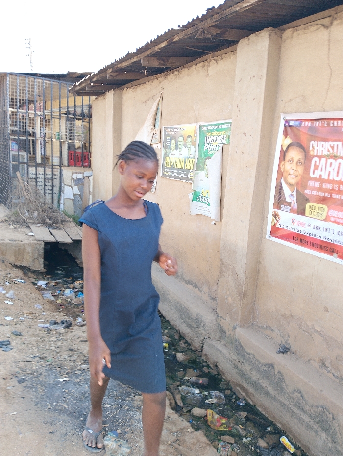 An outdoor scene in Kubwa, Nigeria, features a young female subject walking on unpaved ground alongside a light brown, plastered wall