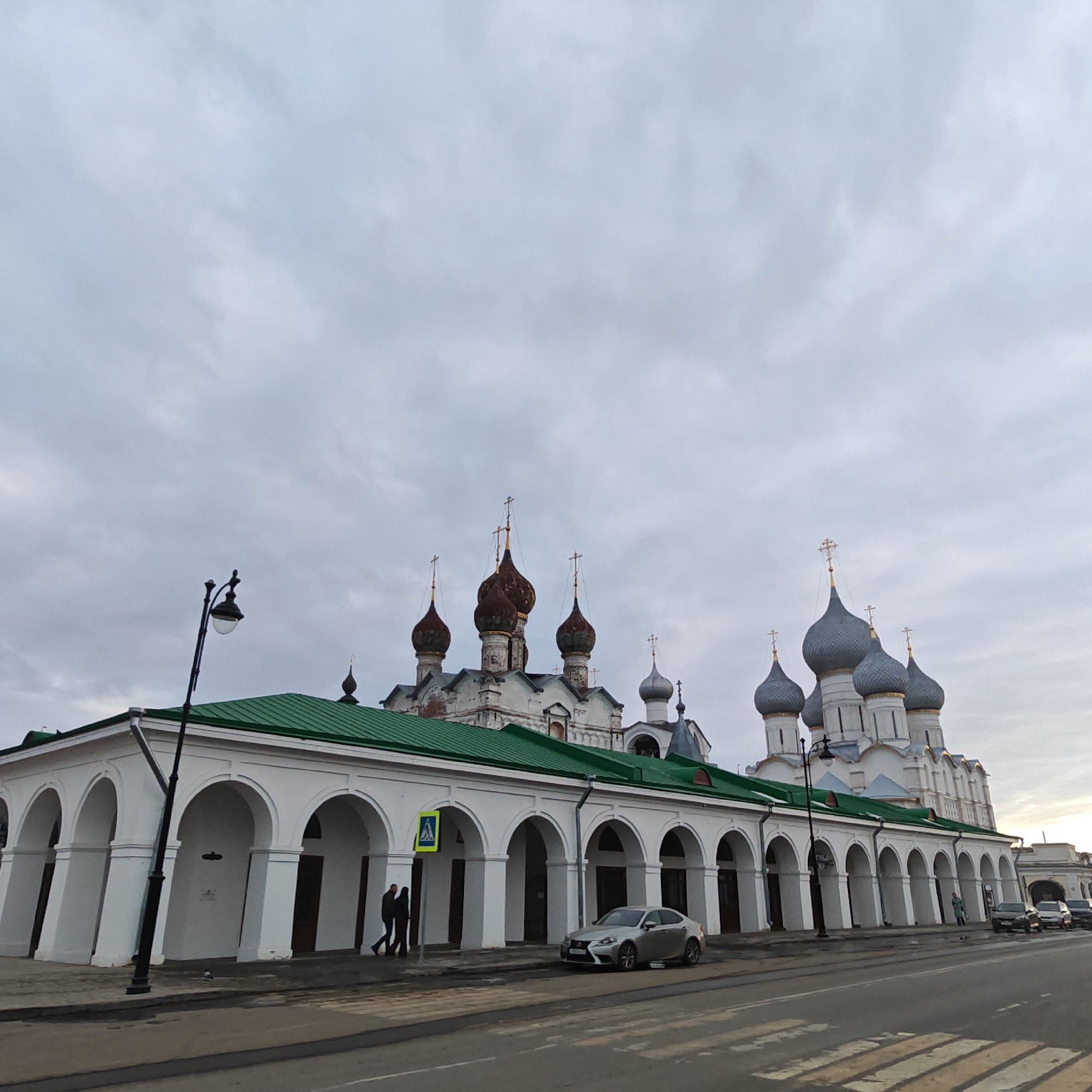 The image displays an urban street scene in Kladovitsy, Russia, under an overcast sky. In the foreground, a two-lane asphalt road with a pedestrian crossing marked by white stripes occupies the lower portion of the frame. A raised sidewalk runs parallel to the road on the left, where a tall black streetlamp post with a clear, spherical fixture is positioned. Midground features a long, single-story building with a white facade and a vibrant green sloped roof. The building incorporates a series of open, arched porticos along its length. Two human figures, indistinct in detail, are walking from left to right on the sidewalk beneath these arches on the left side of the building. A yellow triangular pedestrian crossing sign is affixed to one of the white pillars. A silver four-door sedan is parked curbside in front of the building, facing left. Further down the street to the right, another individual stands near an archway, and additional vehicles, including several dark sedans and a white SUV, are parked along the curb. The background is dominated by a complex of traditional Russian Orthodox churches located behind the green-roofed building. These structures feature multiple onion domes. On the left, a cluster of reddish-brown, weathered domes topped with golden Orthodox crosses rises from an aged white church building. To the right, a separate cluster of uniformly grey/silver domes, also crowned with golden Orthodox crosses, surmounts a lighter-colored church structure. The sky is entirely overcast with a uniform light grey cloud cover, indicating diffused natural light.