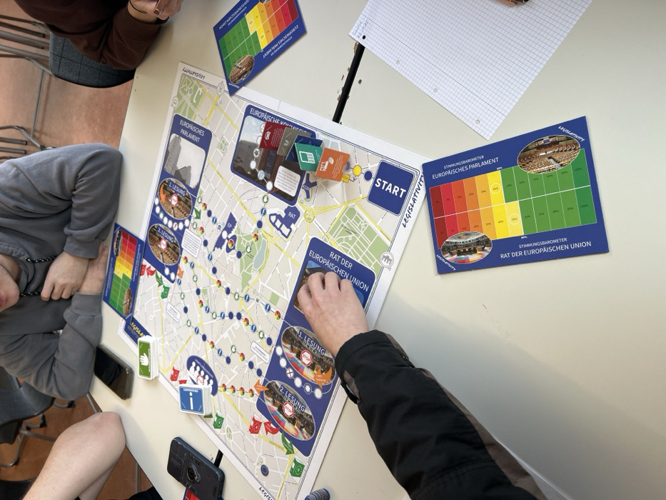 An overhead view captures an indoor scene of at least three individuals gathered around a light-colored rectangular table, actively engaged in playing a board game. The specific location within Heilbronn, Germany, cannot be determined from the visual evidence. The central subject is a large, colorful board game titled "LEGISLATIVITY," spread across the table. The game board features a stylized map with interconnected paths, circular spaces, and various icons. Several game cards with German text, including "1. LESUNG" (1st Reading) and "2. LESUNG" (2nd Reading), are visible, depicting what appears to be a legislative chamber. Two blue player boards/scorecards, labeled "EUROPÄISCHES PARLAMENT" (European Parliament) and "RAT DER EUROPÄISCHEN UNION" (Council of the European Union) with "STIMMUNGSBAROMETER" (Mood Barometer) grids, are positioned at the top-right and bottom-center. Small, colored tokens (orange, green, blue) and a yellow "START" token are on the board. A stack of green cards with a white hand icon is near the top-left. Three individuals are partially visible. One individual, wearing a grey hooded sweatshirt, is seated at the top-left, observing the game with their chin resting on their clasped hands. A second individual's left arm, clad in a dark jacket, extends from the bottom-left, with their hand manipulating game pieces on the board, specifically near a card labeled "RAT DER EUROPÄISCHEN UNION." A third individual's right arm and hand are visible on the right side of the table, poised over a piece of white grid paper with punched holes. Two dark-colored mobile phones are present on the table: one face down near the individual in the grey sweatshirt, and another with a patterned case near the bottom-left. The table surface exhibits minor scuff marks. In the blurred background, parts of dark, possibly metal-framed chairs are discernible, suggesting an institutional setting such as a classroom or common room.
