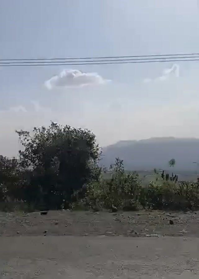 landscape on a sunny day. In the foreground, there is a gray, rocky surface and some bushes. In the background, there is a mountain range under a sky with scattered clouds. Power lines stretch across the top of the frame. The camera is shaky and possibly moving.