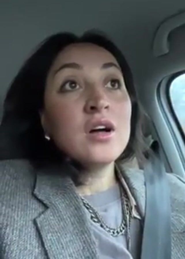 woman in a car, wearing a gray blazer and a silver chain necklace. She is also wearing a seatbelt. She makes exaggerated lip pursing gestures, then makes a grimace. The setting appears to be inside a car during the day, with a glimpse of a rainy window.