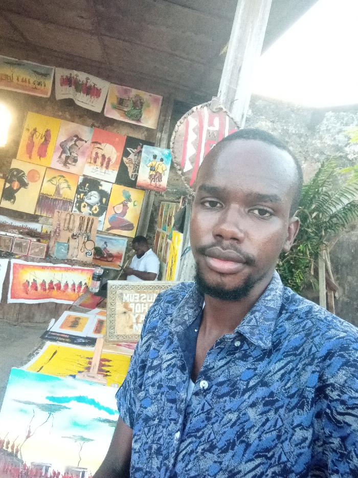 This image depicts an art and craft market stall, consistent with locations found in Makadara/Mji Wa Kale ward, Kenya. In the foreground, a male, approximately 20-35 years old, with dark skin, short dark hair, and a trimmed beard and mustache, is seen from the chest up, looking directly at the camera. He is wearing a short-sleeved blue button-up shirt with an abstract pattern. His left hand, visible at the bottom left, holds a painting depicting an African landscape with figures and acacia trees under a turquoise sky. Behind the foreground subject, a wall covered with numerous rectangular paintings is visible. These paintings feature African cultural themes, including Maasai warriors, women, and various landscapes with iconic acacia trees. Below the wall-mounted art, a display table holds more paintings, including a prominent one of Maasai figures in red attire, alongside stands displaying necklaces made from beads and other natural materials. A reflective sign, partially obscured and displaying "MUSEUM SHOP" inverted, is situated near the foreground subject's right arm. To the right of the foreground subject, a round, traditional-style shield with red, white, and brown patterns hangs from a wooden post. In the mid-ground, another male, wearing a white short-sleeved shirt, is partially visible behind a counter or table, appearing to be attending to items or engaging in an activity. Green foliage is visible in the far right background, suggesting an outdoor or semi-open-air setting, illuminated by natural daylight.