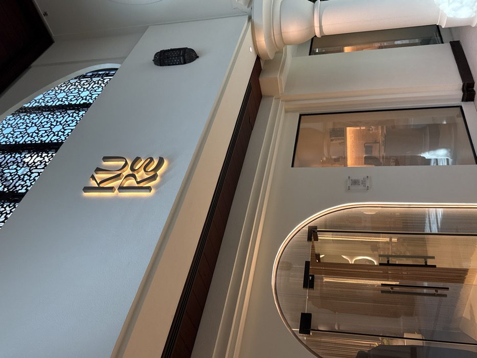 The image depicts an interior architectural space. The left side features a white wall with a decorative window above and the word "Kse" in stylized lettering with light emanating from behind. A dark, decorative object is positioned above the lettering. The right side showcases a white column detail with a brown accent piece, several rectangular window panes, and a rounded, illuminated display case below.