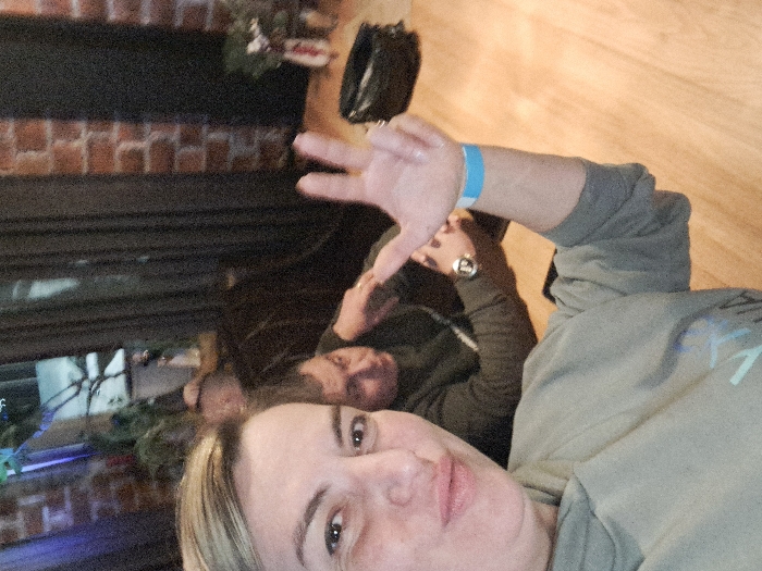 A selfie shows two adults. One closer to the camera is a fair-skinned woman with short blond hair wearing a blue wristband and a gray sweatshirt. She's making a hand gesture. Behind her, another person with darker hair is visible. The background includes a wood floor, a brick and black wall, a black purse, and some greenery with blue lighting. The image is rotated to the right.