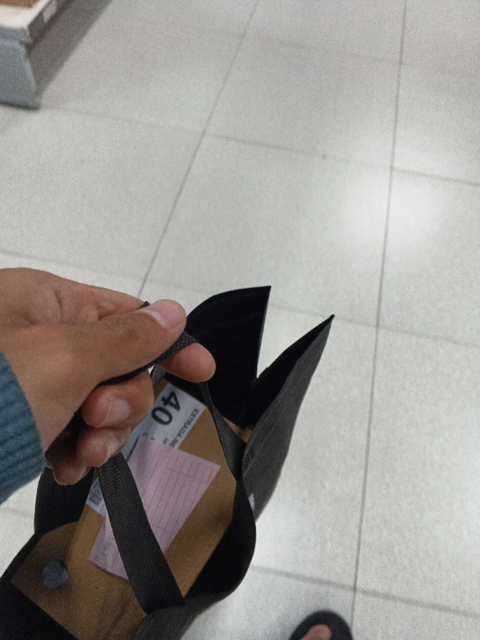 A person holds a dark-colored shopping bag with a brown interior and a shipping label visible. The label displays the number "40" prominently. A pink sheet with grid lines is also inside the bag. The person's hand and a sleeve are partially visible. The background is a floor made of light-colored tiles. Part of a foot wearing a flip-flop is also seen in the lower right corner.
