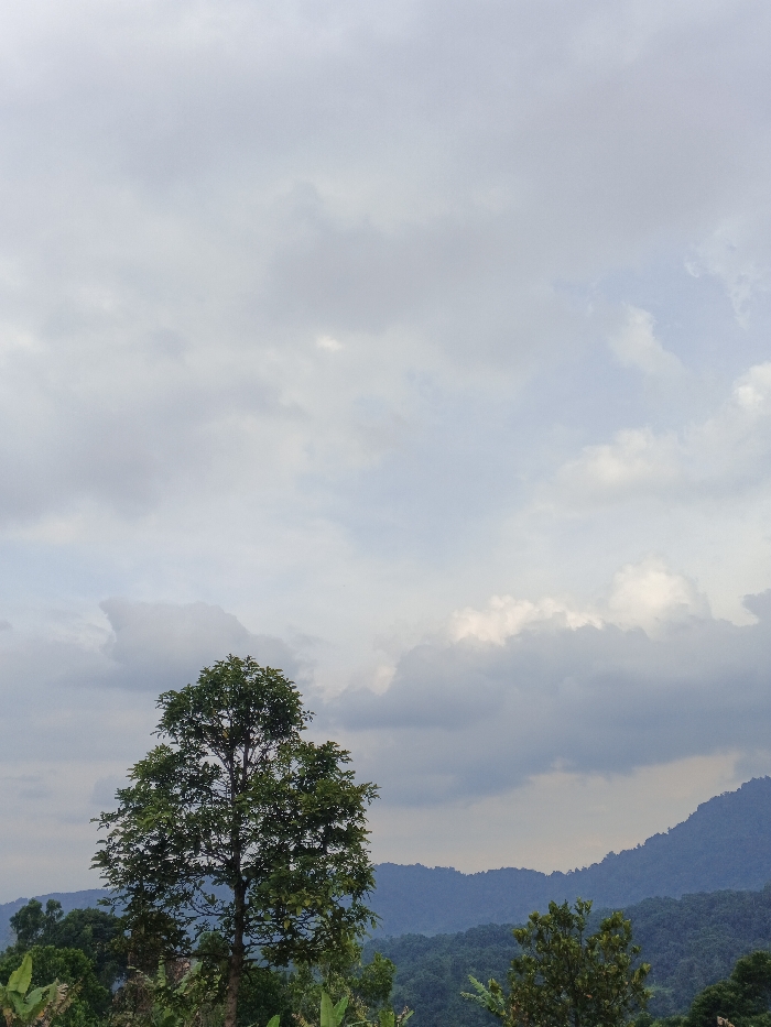The image displays a mountainous landscape located within the city of Đà Nẵng, Vietnam, under a heavily clouded sky. The upper two-thirds of the frame are dominated by an overcast sky, filled with dense, irregular formations of white and grey clouds; intermittent patches of pale blue sky are visible. In the mid-ground, a solitary, tall tree with a dark, slender trunk and a full, rounded canopy of vibrant green foliage stands centrally. Below and around this prominent tree, a dense layer of additional green vegetation, including broad-leafed plants, extends across the lower portion of the scene. The background consists of a continuous range of densely forested mountains or large hills, appearing in successive shades of dark green and bluish-grey, indicating depth and atmospheric distance. No human figures, artificial structures, or active interactions are present within the depicted natural environment.