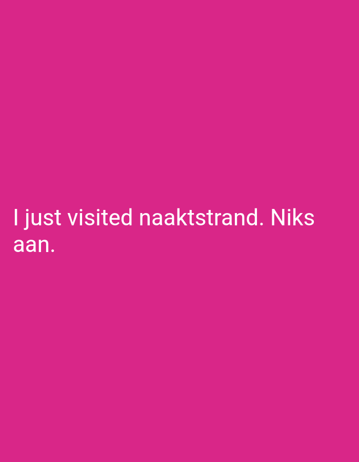 The image displays white sans-serif text against a solid magenta background. The text reads: "I just visited naaktstrand. Niks aan." This Dutch phrase translates to "I just visited a nudist beach. Nothing special/It was disappointing." The image communicates a personal statement regarding a past visit to a nudist beach and the visitor's subsequent unenthusiastic assessment of the experience. The implied location of the "naaktstrand" (nudist beach) referred to in the text, within the city of Ouderkerk aan de Amstel, Netherlands, corresponds to the Naaktstrand Ouderkerkerplas located at the Ouderkerkerplas lake. No people, objects, or actions other than the textual statement are visually depicted within the image frame.