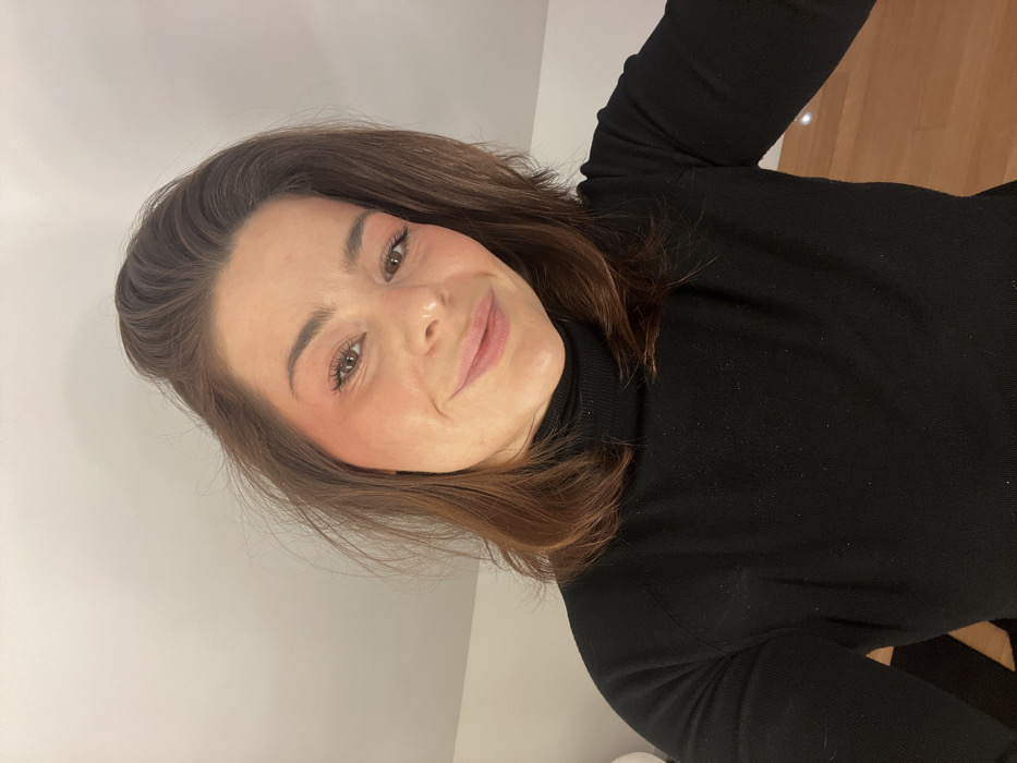 The image depicts a close-up, chest-up selfie of an adult female in an indoor setting. The specified location is Carency, France, though no specific visual identifiers within the image confirm this geographical detail. The subject is a female with medium brown hair, parted slightly off-center, reaching to her shoulders. Her skin tone is light, and she wears visible makeup, including pink blush on her cheeks, defined eyebrows, and mascara or eyeliner. She is dressed in a fitted black turtleneck sweater. Her expression is a subtle, closed-mouth smile, and she is looking directly at the camera lens, indicating she is holding the device herself. The background is minimalist, featuring a plain light-colored wall or ceiling in the upper portion of the frame and a light-toned wooden floor visible towards the lower right. The environment appears well-lit and uncluttered, characteristic of an interior room. No other individuals or significant objects are discernible in the scene.