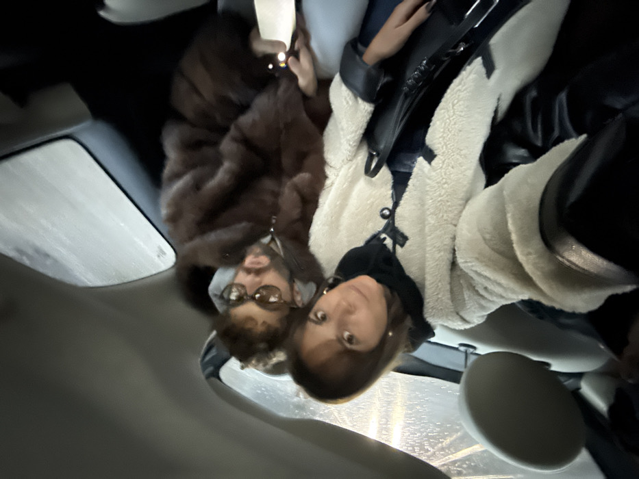 A man and a woman pose for a photo in a car. The man wears a brown fur coat and round sunglasses, holding a phone. The woman wears a white sherpa coat with black leather trim and a black scarf. A black purse sits beside her. Rain streaks the car window, and the interior is light gray. The image is taken at an angle, with the right side angled down.