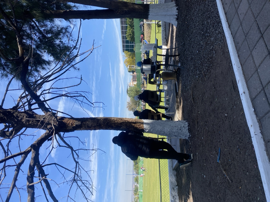 An outdoor scene shows a grassy field with people playing sports in the distance, framed by a partially barren tree on the left. Several people are seated at a table behind a white-painted fence and tree trunks, with additional chairs arranged nearby. The ground transitions from dirt and gravel to a paved walkway. The sky is blue with wispy clouds.