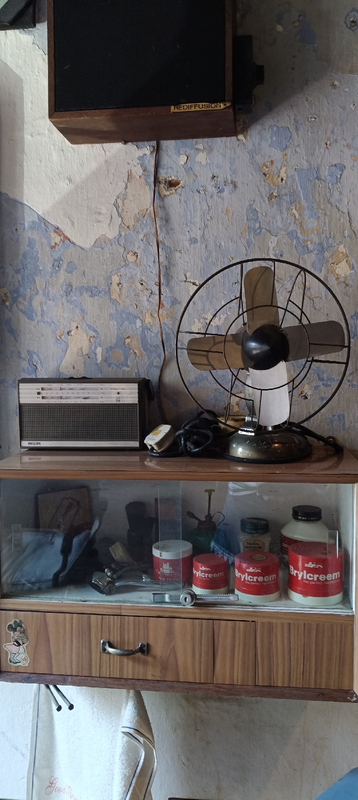 A vintage radio sits atop a wooden cabinet with glass doors, showcasing vintage hair products like Brylcreem. An antique fan stands next to the radio. Above, a speaker labeled "Rediffusion" is mounted on a weathered wall with peeling paint. The cabinet has a drawer underneath, with a Minnie Mouse sticker on the side. A towel hangs below the cabinet, embroidered with "Good Morning."