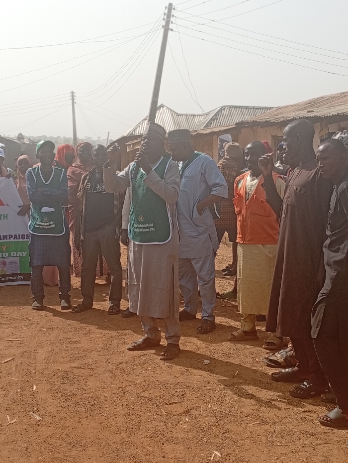 A group of people stand outside. A man in the foreground wears a green vest and speaks into a microphone. Several other men stand nearby, some wearing traditional hats. Buildings are visible in the background. The ground is a reddish-brown color. An electric pole rises behind the group. The overall scene suggests a gathering or event in a rural or semi-rural area.