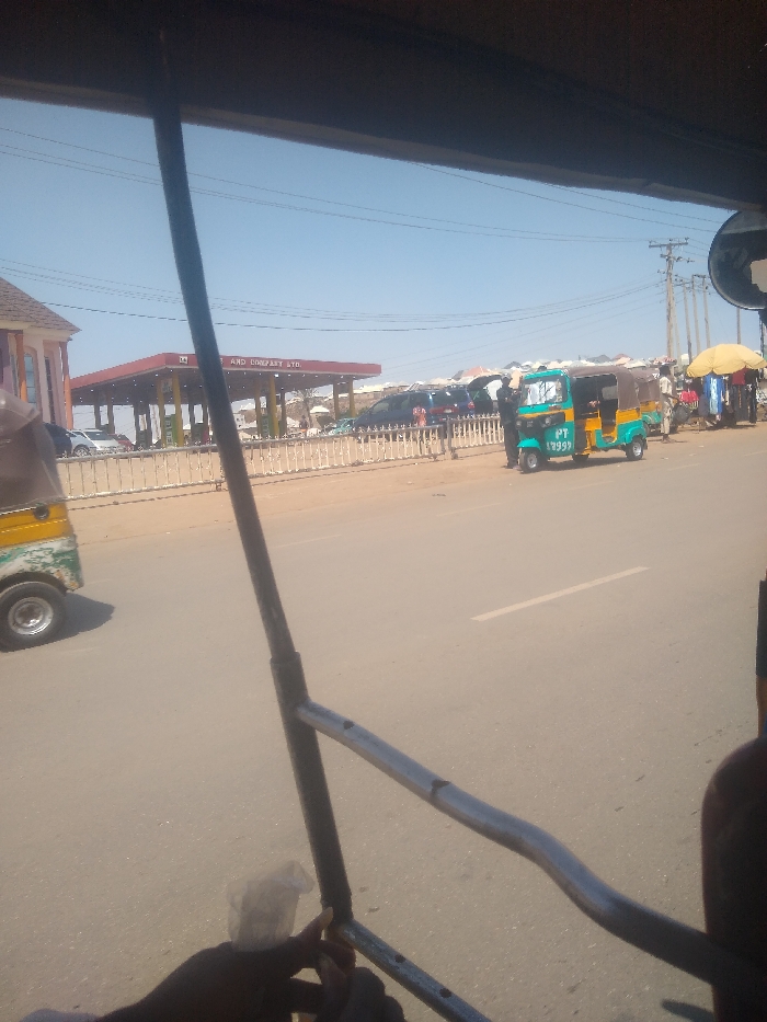 The image presents a street scene in Jos, Nigeria, viewed from within a vehicle, likely a tricycle, evidenced by the foreground's dark structural bars and a partial wheel on the lower left. The sky is uniformly clear and bright blue. On the left side of the paved road, a gas station with a red canopy and multiple yellow support pillars is prominent. A sign on the canopy reads "AND COMPANY LTD." Several vehicles, including a dark SUV with its tailgate open, are visible at the gas station. A white metal barrier separates the station's frontage from the road. To the right of the road, a blue and yellow motorized tricycle, marked with "PT 12999", is parked on an unpaved shoulder. An individual stands adjacent to this tricycle. Further right, a market-like area with a yellow umbrella and various displayed items is visible. Utility poles and power lines are present against the sky on the right. In the immediate foreground, a hand holds a small, white, wrapped object against a silver metallic frame element of the viewing vehicle. The asphalt road features faint white lane markings in the distance.