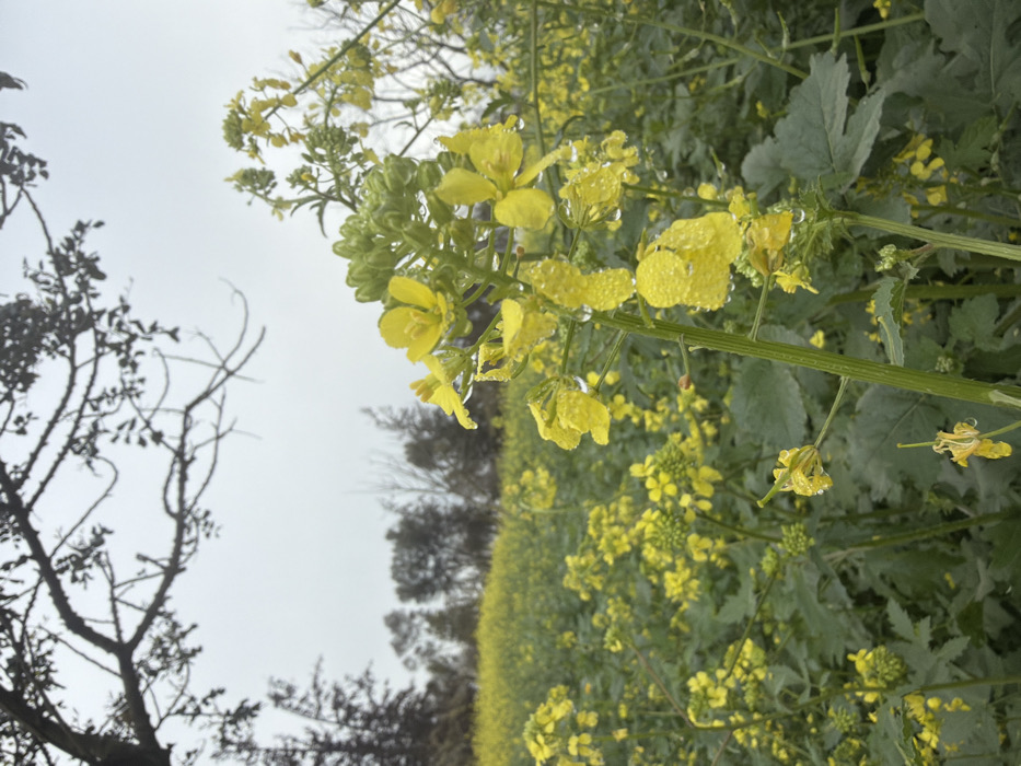 A field of vibrant yellow flowers stretches into the distance under a cloudy sky. The blossoms are covered in small droplets, possibly dew or rain. A close-up of the flowers reveals their delicate, four-petaled structure. To the left, a bare tree stands in silhouette against the overcast backdrop, adding a stark contrast to the bright floral landscape. Other trees in the distance further frame the scene.