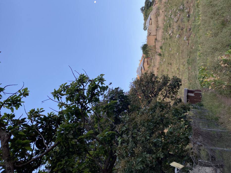 The image displays a hilly, semi-rural landscape in Gwong, Nigeria, under a clear, light blue sky featuring a visible crescent moon in the upper right quadrant. The foreground on the left is occupied by a large tree with dense green foliage. Beneath the tree, a chain-link fence is partially visible, with a small, white, rectangular object attached to a nearby pole. A narrow dirt path ascends from the bottom center, leading up a dry, grassy slope. To the right of this path, a small, rustic shed with reddish-brown corrugated metal walls and roof is situated. The midground and background consist of a pronounced hill, sparsely covered with dry grass and numerous exposed rocks. On the upper slope and crest of the hill, several single-story, earth-toned structures with light-colored, possibly corrugated roofs are visible, suggestive of dwellings, some delineated by low perimeter walls. No individuals, actions, or interactions are depicted within the scene.