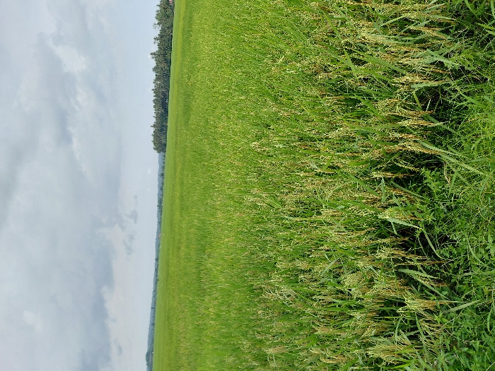 An expansive green rice field stretches to the horizon under a cloudy sky. The field is verdant, with the rice stalks appearing lush and healthy. A line of trees marks the distant edge of the field. In the foreground, the rice plants are taller, with visible grains. The overall scene conveys a sense of tranquility and agricultural abundance.