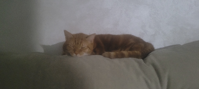 - "An orange tabby cat is asleep on a tan sofa" by FM-lpZ3r2, licensed under CC BY 4.0