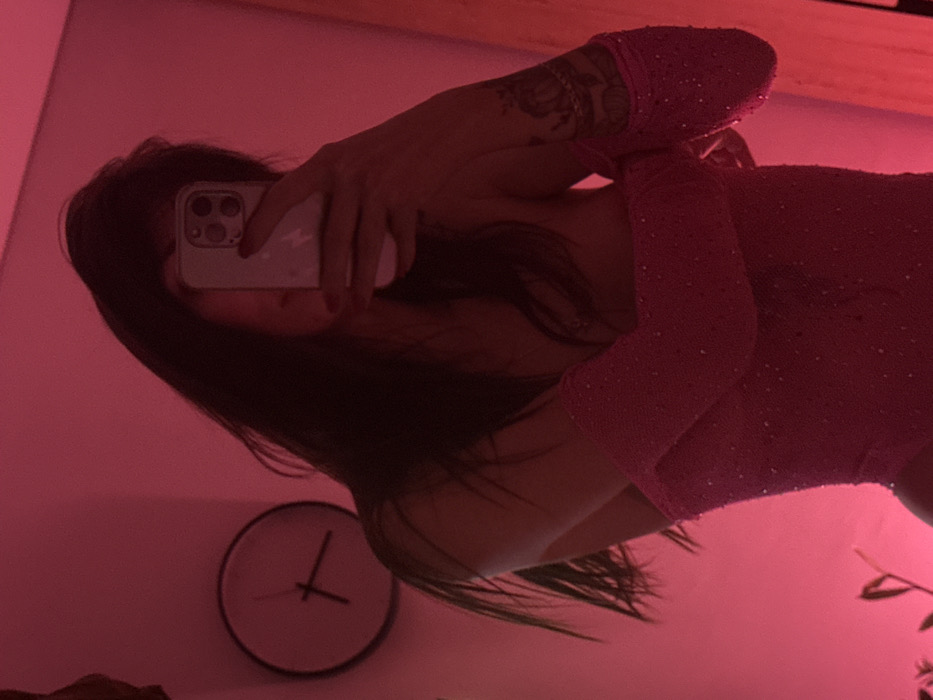 A person with long, dark hair takes a mirror selfie with a phone. The person wears a sparkling pink outfit with long sleeves. The background is pink and includes a clock on the wall that reads 8:25. A tattoo is visible on one arm.