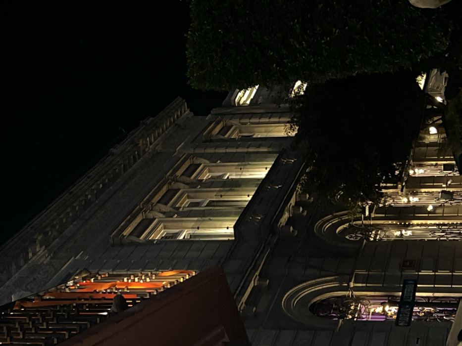 An upward-angled nighttime view captures a multi-story, classically-styled building at the intersection of Plaza de la Paz and Calle Allende in Guanajuato City, Mexico