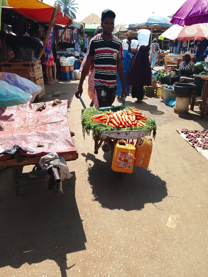 - "In a bustling outdoor market, a vendor pulls a wheelbarrow piled high with vibrant orange carrots atop green foliage" by FM-COgBk1, licensed under CC BY 4.0