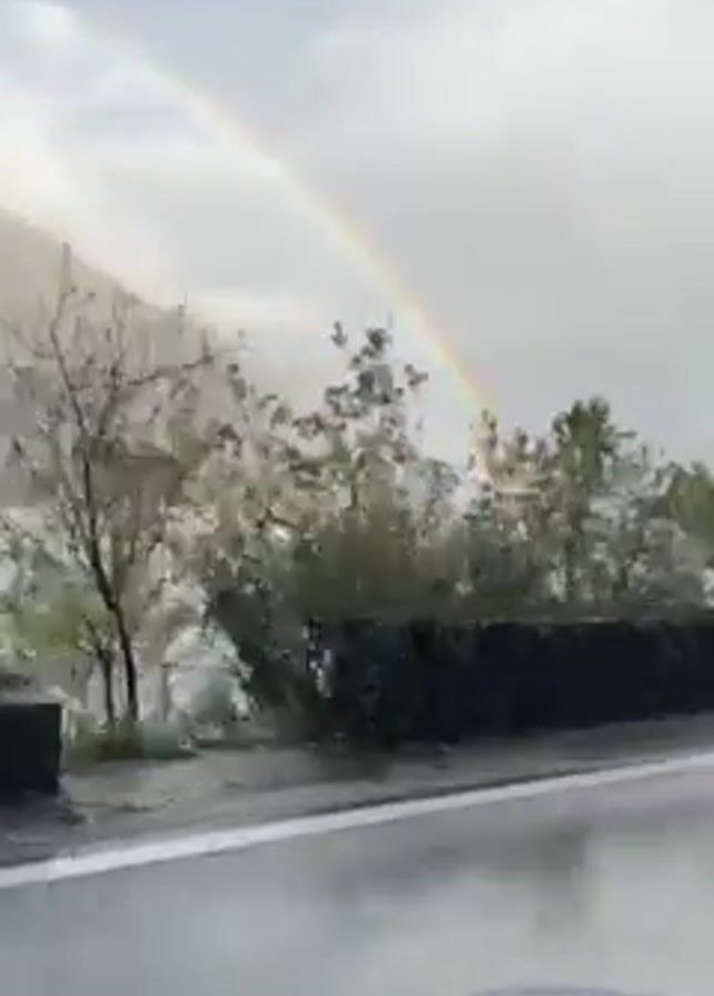 The video, shot from a moving vehicle, captures a stunning rainbow arcing across a landscape of water and mountains