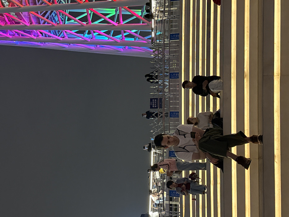 The image depicts a nighttime scene in Haizhu District, Guangzhou, China. The Canton Tower, illuminated with vibrant pink, purple, blue, and green lighting, is prominently visible on the right side of the frame. In the foreground, a male with dark hair and fair complexion, wearing a white t-shirt with a grey harness-like design, dark green pants, and brown shoes, is seated cross-legged on a concrete staircase. He is looking downwards, focused on a black smartphone held with both hands. The staircase features integrated horizontal strip lighting on each step, illuminating the immediate area. To the left of the foreground male, on a higher step, a female in a blue jacket and jeans is seated, looking down. To his right, on the same step, a female with light brown hair in a light-colored long-sleeved top and dark pants is seated, also looking downwards. Further right and on a higher step, an individual in dark clothing and light pants is seated. In the mid-ground and background, approximately 10-15 additional individuals are dispersed across the higher sections of the staircase and behind a metal barrier system. This barrier separates different areas and has signs affixed, displaying Chinese characters, including "请勿攀爬" (Do not climb). Some individuals in the background are standing, while others are seated. The sky above is dark grey, consistent with nighttime conditions. No direct interactions between the foreground subject and other individuals are observable; most appear engaged in personal activities or observing the surroundings.