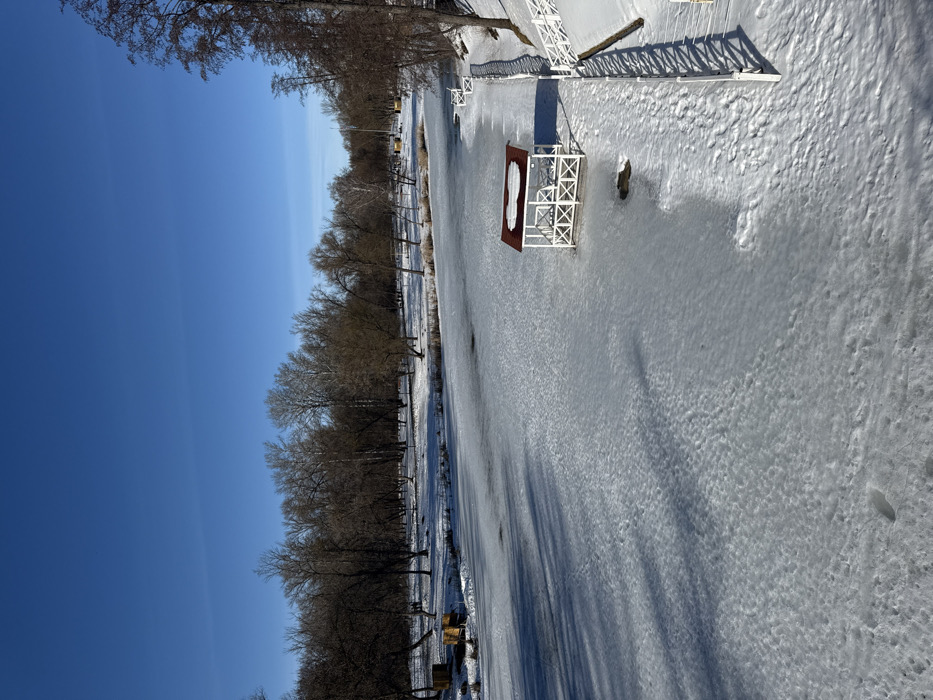 The image depicts a winter scene within Bolshoy Park in Kursk, Russia, under a clear, bright blue sky. A large pond or small lake is entirely frozen and covered by a textured layer of ice and snow, displaying varied patterns and some darker, more translucent areas. Long, dark shadows are cast diagonally across the frozen surface from the left. A white, open-sided gazebo with a red, snow-dusted roof is situated on the ice, approximately one-third of the way from the right bank. This gazebo features white decorative cross-bracing on its side panels. The right bank is snow-covered and slopes gently, bordered by a long, white wooden fence or railing that casts distinct shadows onto the snow. Two white park benches are visible further along this right bank. The left bank and background are densely populated with bare, deciduous trees, their branches devoid of foliage and dusted with snow. Several yellow rectangular objects are partially visible on the snow near the far left bank. No individuals, actions, or interactions are present within the scene.