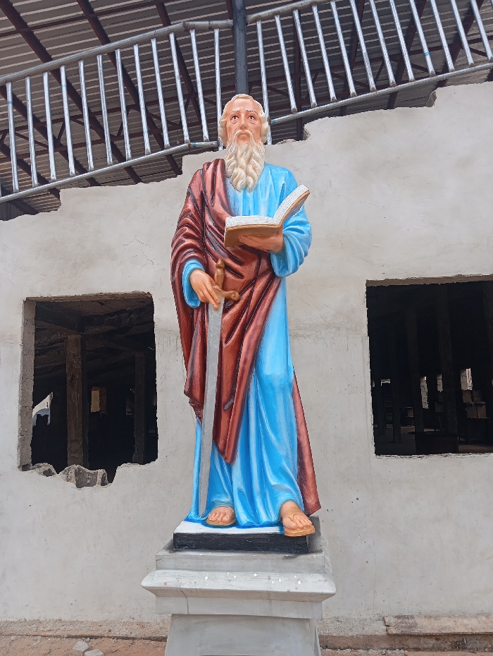 A polychrome statue, depicting a bearded man, likely Saint Paul, stands vertically outdoors in Onitsha, Nigeria