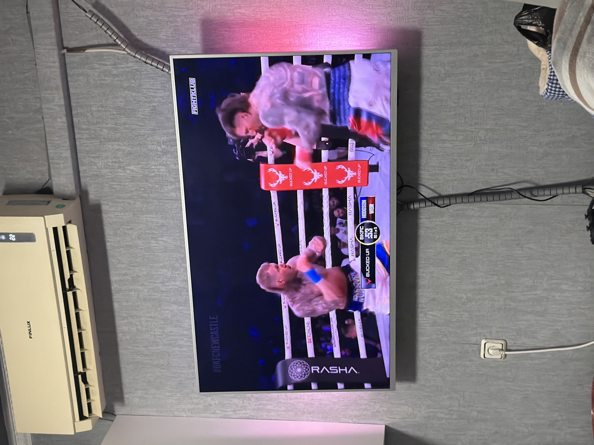 The image displays an indoor scene, observed from a slight downward angle, set within a location in the city of Goce Delcev, Bulgaria. **Environment:** The background wall is covered with a textured gray wallpaper. Mounted high on the wall is an off-white FINLUX brand split-system air conditioning unit, displaying "22" on its digital screen, with its vents open. Directly below the air conditioner, a flat-screen television with a silver bezel is mounted. To the right of the television, a pink/magenta light source illuminates the wall. A white electrical outlet is visible on the lower left wall, with a white power cord plugged into it, extending downwards. Below the television, a bundle of black cables is organized with gray spiral cable wrap, descending towards the floor. In the bottom right corner, a striped blanket and a checkered fabric item are partially visible. **Television Content:** The television screen displays a broadcast of a Bare Knuckle Fighting Championship (BKFC) event. On-screen text includes "#BKFCNEWCASTLE" and "FIGHTKLUB." Two male bare-knuckle boxers are engaged in combat within a ring. * **Left Boxer (Hodgson):** This boxer has a light-colored, possibly blonde, mullet hairstyle, a muscular build, and extensive tattoos covering his arms and torso. He wears white shorts with blue accents and blue wrist tape on his left hand. He is depicted in a boxing stance, appearing to block or prepare a punch. His name, "HODGSON," is displayed below him on the screen, alongside a timer/score indicator reading "BKFC 53 MIN 5." * **Right Boxer (Weir):** This boxer has darker hair, possibly styled as a mullet, a muscular build, and extensive tattoos on his arms and torso. He wears white shorts with red and blue accents and red wrist tape. He is actively engaged with the left boxer, appearing to be mid-punch or deflecting. His name, "WEIR," is displayed below him on the screen. * **Ring Details:** The boxing ring features a red corner post adorned with a "BUCKED UP" deer antler logo, and a black corner post with a "RASHA" logo. Ring ropes display sponsor branding, including "BETONLINE" and "BUCKED UP."