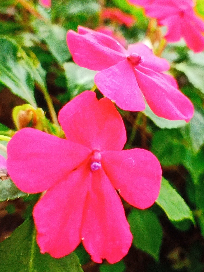 The scene depicts a close-up, high-saturation view of flowering plant life, located in the city of Taungpi, Myanmar (Burma). The primary subjects are two distinctly visible five-petaled flowers, rendered in a vibrant fuchsia or deep pink coloration. The largest flower, positioned in the lower-center of the frame, features five broadly ovate petals arranged symmetrically around a compact, purple-red central reproductive structure. A second similar flower is partially visible in the upper-right quadrant, also displaying five petals and a fuchsia hue. Surrounding and underlying these subjects is a dense matrix of green foliage, largely out of focus, consisting of numerous leaves and stems. No human subjects, animals, or man-made objects are discernible within the frame. The environmental lighting suggests an outdoor setting.