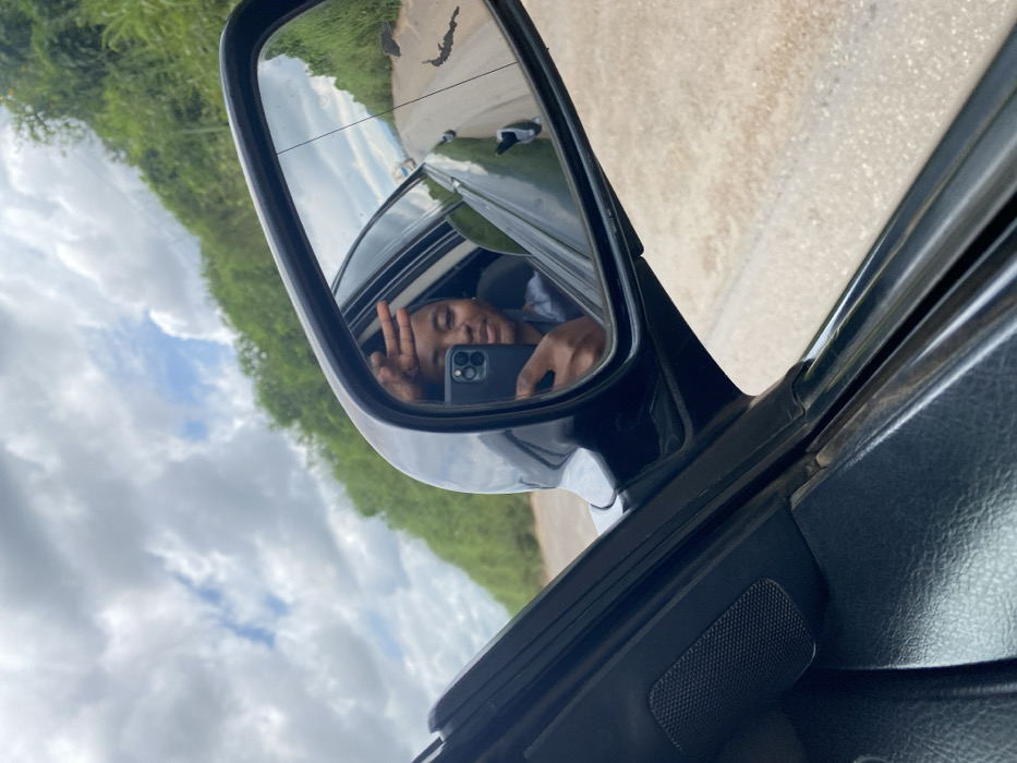 The image depicts a scene captured from within a dark-colored vehicle, angled towards the front passenger side exterior mirror. Reflected in the mirror is an individual, appearing to be an adult with dark skin, holding a dark-colored smartphone (equipped with a multi-lens camera module) in their right hand, pointed towards themselves, indicating the act of taking a selfie. Their left hand is raised, forming a "V" shape with two fingers. The individual exhibits a subtle smile. The immediate foreground reveals parts of the vehicle's interior, including a dark door panel and an integrated speaker grille. Beyond the vehicle's frame and reflected in the mirror, the exterior environment shows an unpaved or dirt road surface with visible wear and patches, stretching into the distance. The road is bordered by dense, lush green vegetation, consisting of trees and shrubs, which lines the landscape. The sky above is partly cloudy, with significant white and grey cloud formations interspersed with patches of blue. The overall environment suggests a rural or semi-rural setting. The location is specified as Abobo, Nigeria.