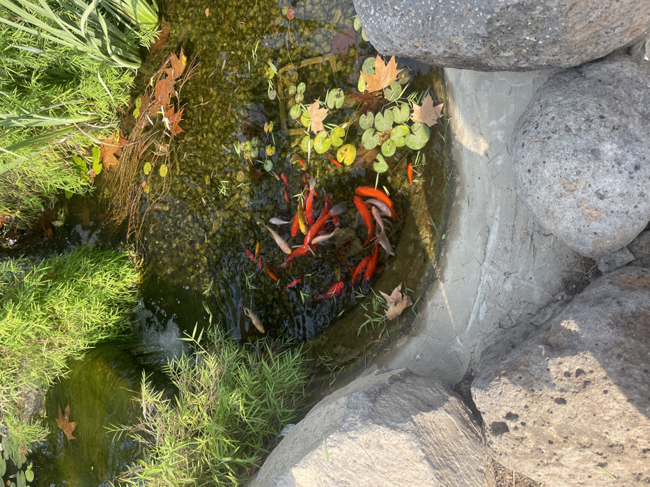 This image depicts an artificial pond located in Tel Mond, Israel. The pond's perimeter is constructed with large, irregular natural stones of various gray and brown tones, complemented by a visible concrete lining. The water is clear, revealing a dark, gravelly bottom and reflects sunlight, indicating an outdoor, daytime setting. Approximately 30 to 40 fish are present in the water. The majority are bright orange goldfish, ranging in size, while a smaller number of lighter, silver-colored fish are also observed. The fish are clustered predominantly in the lower-central and right portions of the pond, appearing to be in motion. Aquatic vegetation is present, including small, circular green water lily pads floating on the surface, primarily in the right-central area. Tall, thin-leaved green plants, resembling reeds or grasses, grow along the upper and left edges of the pond. Several brown, dried deciduous leaves, likely from a maple or similar tree, are scattered on the water surface and along the concrete and stone edges. In the upper-left quadrant, a small source of agitated water is visible, indicating a water feature or pump outlet, creating minor surface disruption. No human subjects or their direct interactions are depicted in the scene.