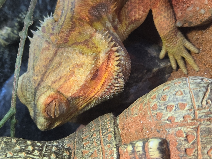 A close-up image displays a reptile, likely a bearded dragon or similar lizard, resting with closed eyes