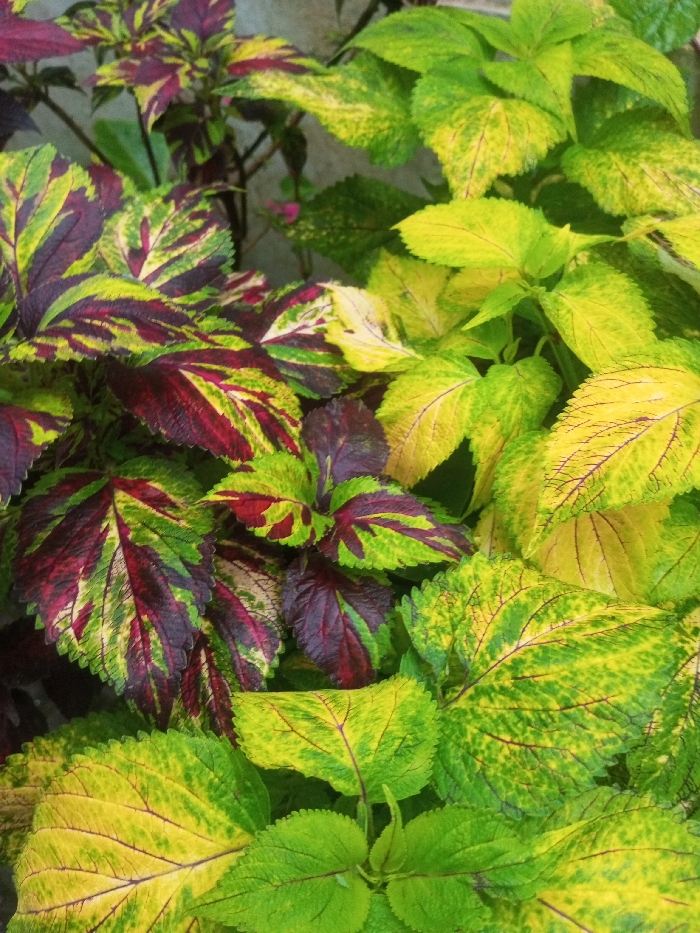 - "The image displays a dense cluster of variegated plant foliage, likely Coleus, captured in a close-up vertical orientation" by FM-DhZcv1, licensed under CC BY 4.0